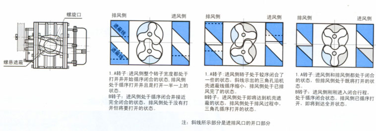 1.螺旋形狀是20℃以上的固定螺旋方式。機殼的進排風屏蔽線切入螺旋,以轉子頂端光面線構成的三角形進排風口,通過轉子的旋轉而循序打開。本風機的進排風口,不象舊式羅茨螺旋風機那樣在瞬間打開或關閉,所以運轉聲音極小,幾乎沒有排風脈動。