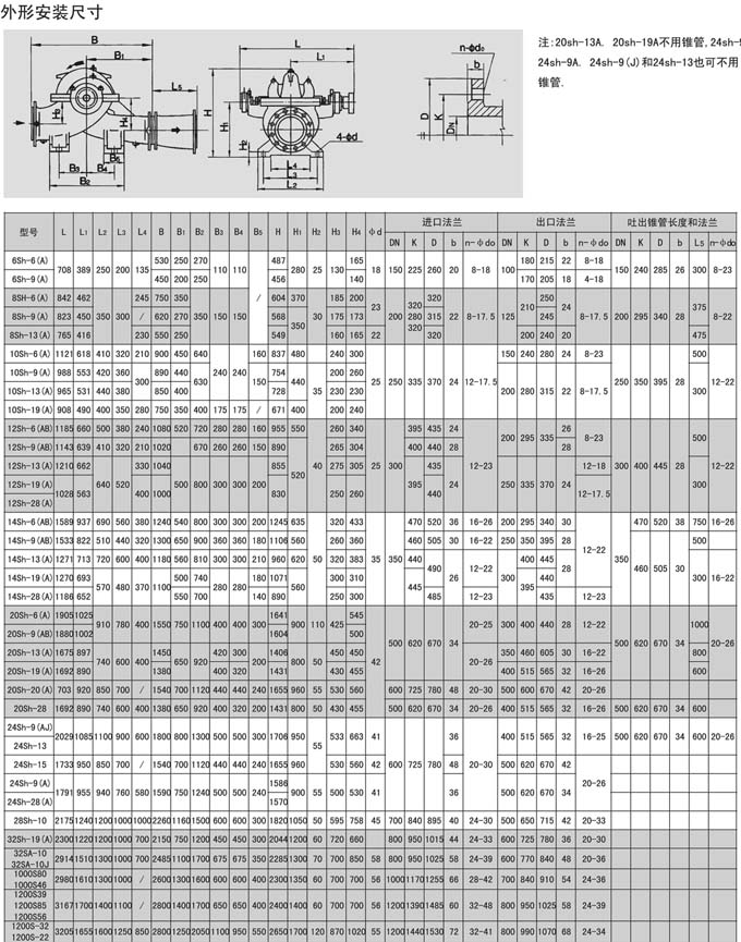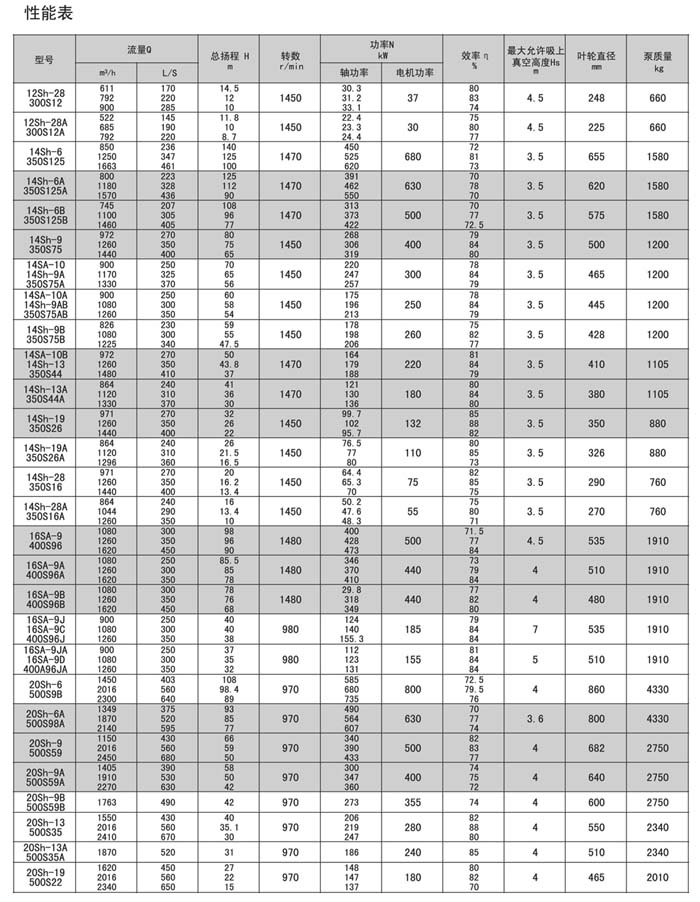 Sh.S.SA型泵是單級,雙吸,泵殼水平中開式離心泵,供輸送清水及物理化學性質類似于水的液體之用。介質溫度80℃,若兩端軸承通以冷卻水,介質可達130℃。改變葉輪,密封環和軸封的材料,可以汲送含有泥沙的渾水,泵的軸封一般采用軟填料,如有特殊訂貨要求,也可裝機械密封。